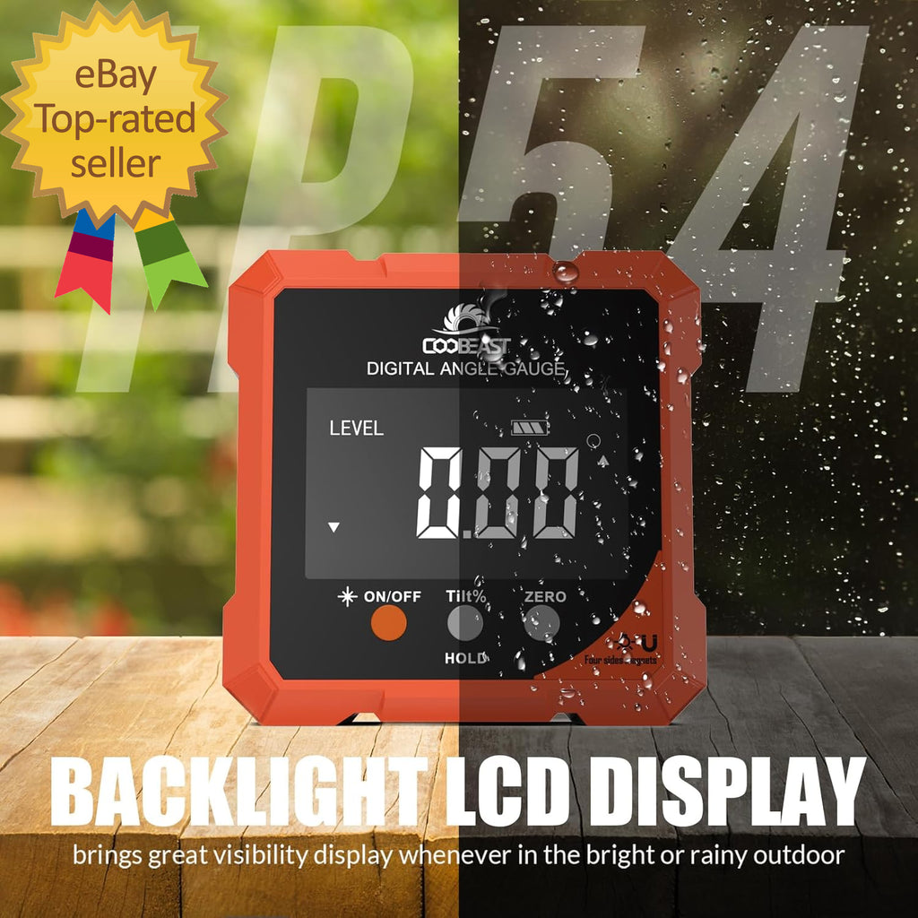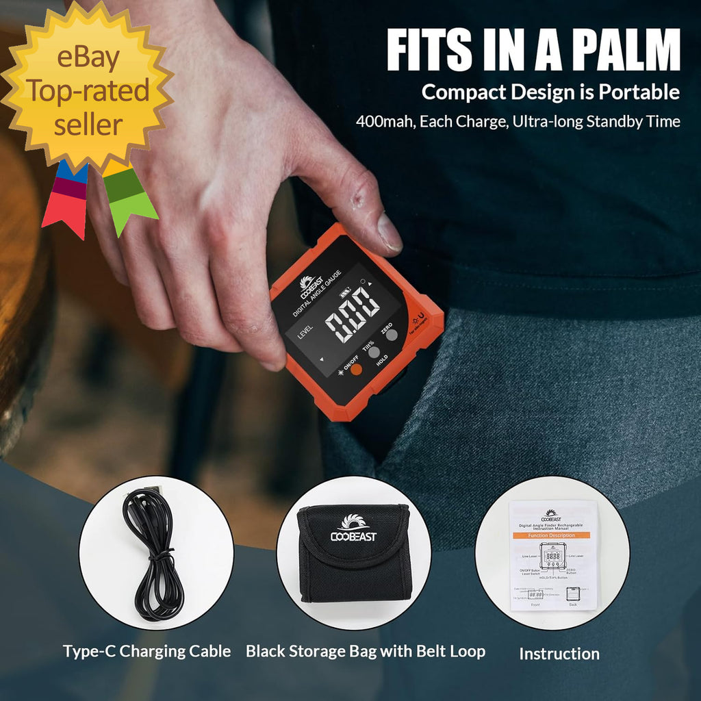 • BACKLIGHT LCD DISPLAY — Digital angle finder with an easy-to-read display for clear measurement results in any lighting conditions. IP54. The palm-sized, compact design of the angle gauge is easy to carry with a black belt storage bag, no matter whether indoors or outdoors is convenient to use. 400mAh, rechargeable, ultra-long standby time, the power display for easy charging in time.