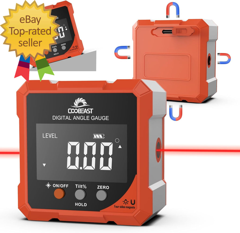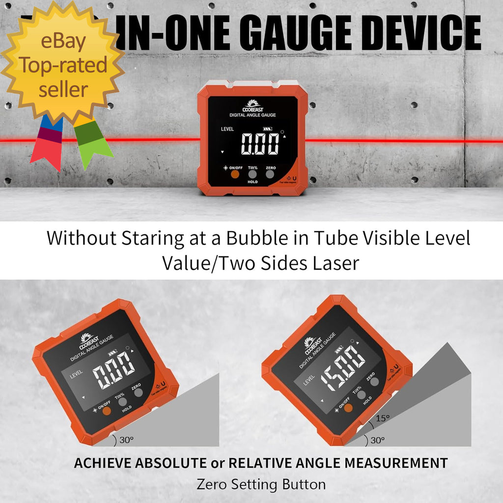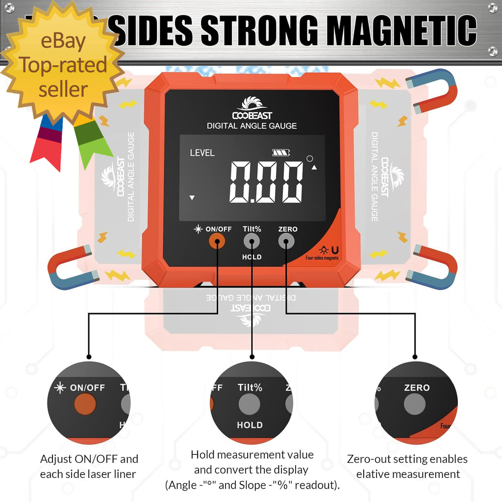 • FOUR SIDES STRONG MAGNETIC — Digital angle finder has strong magnets on four sides that firmly adsorb on the measuring object, ensuring accuracy and not easily falling off. Three easily operated buttons can activate the built-in red laser line on both sides, hold the measured value, switch the unit of the measured value and zeroing function to realize relative measurement.